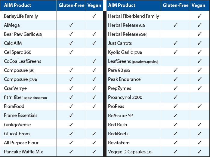Saying no to GMO is truly the healthy way to go. AIM also tested all of its products to determine gluten-free and vegan status.