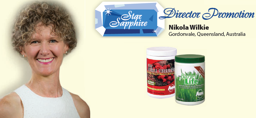 Reaching the elite levels of the AIM Member Income Plan, Nikola Wilkie promoted to Star Sapphire Director in June 2014. Nikola’s association with The AIM Companies™ began in 1998, when she came across AIM Herbal Fiberblend® after reading Cleansing the Body and the Colon for a Happier and Healthier You by Teresa Schumacher, Chairman’s Club Director.